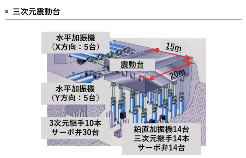 o メインとなる震動台は、縦20m、横15mという巨大サイズ。なんと、縦・横・上下の3方向に揺れを自在に再現できます。